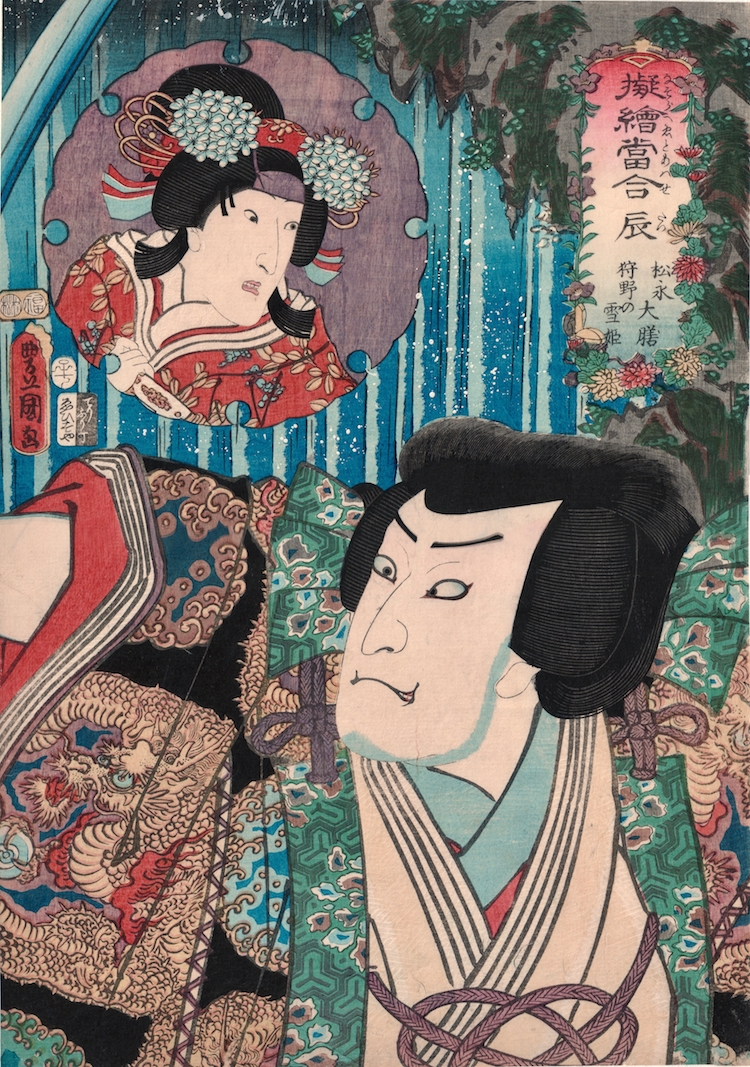 A stunning print, rich in carving and detail and beautiful hand applied, splashed gofun - the white crests of the water are applied without blocks by splashing ink made from ground shells. The print is from a series begun in 1852, the date of this early print, and completed not until 1862! The series is another mitate, this time comparing actors - two per print - with both elements and signs of the zodiac. The sign illustrated on this print is the fifth sign - the dragon. The characters are Princess Yumi, in the cartouche and Matsunaga Daizan in the foreground. Matsunaga’s kimono is richly embroidered with a dragon, giving the image of the zodiac sign to the print.
