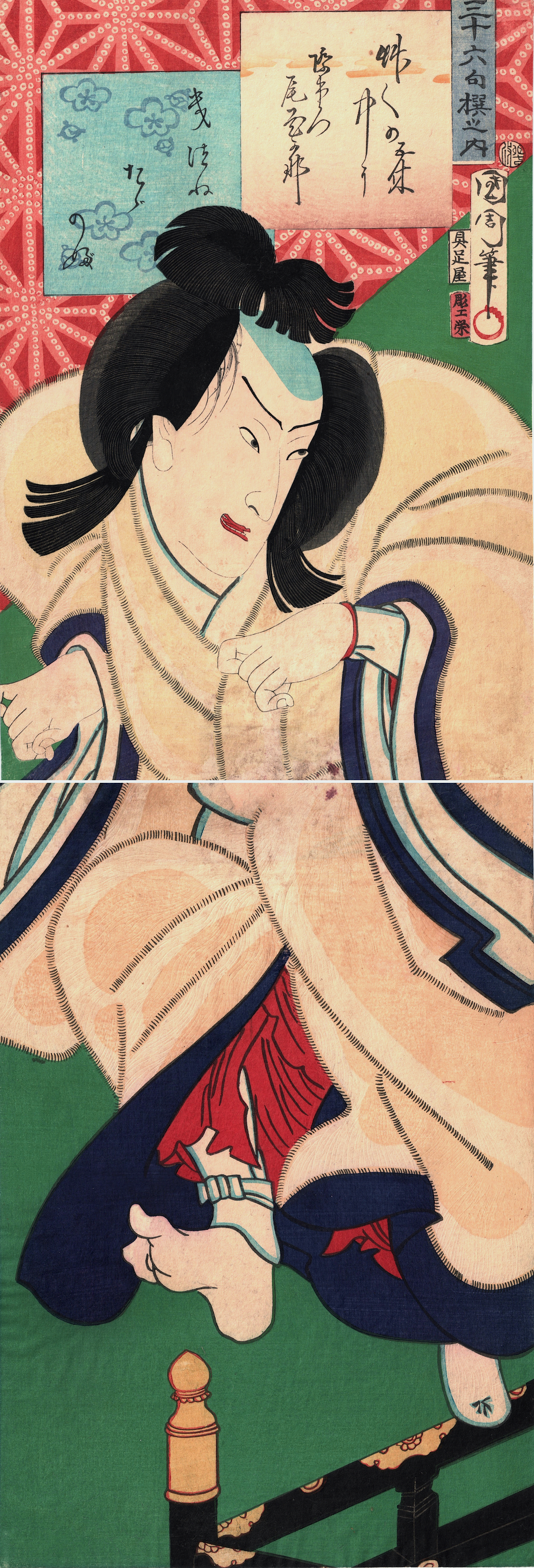 This stunning vertical diptych by Kunichika is from the play, Yoshitsune and the Thousand Cherry Trees. It’s a wonderful print, Kunichika deftly catches the light movement that the kabuki actor makes in the demanding transition from man to fox. Vertical diptychs were unusual formats for ukiyo-e prints. Actor kakemono-e as they are called are even rarer. Kunichika only produced a handful and other Meiji artists like Yoshitoshi maybe only a dozen. This particular print is exceptionally rare. There is a copy in the Waseda University Theatre Museum in Japan, and I know of no others.