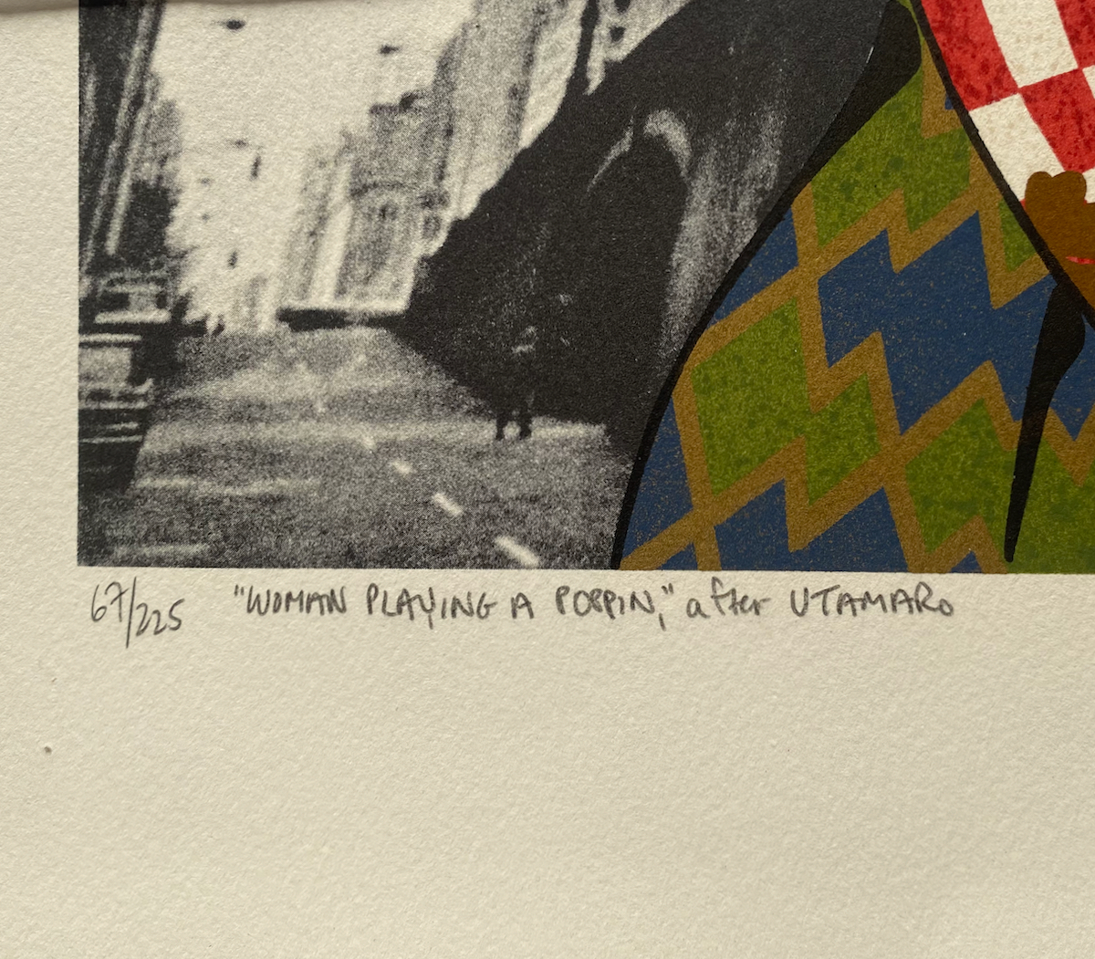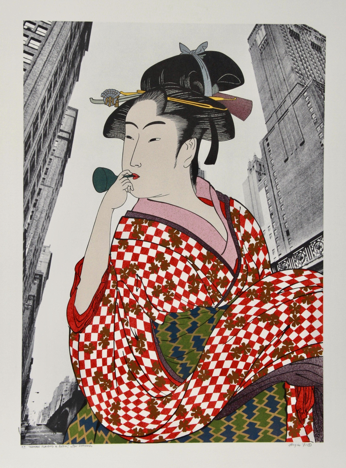 Michael Knigin. (1942 - 2011) Woman Playing a Poppin (After Utamaro), 1981. Large-format Screenprint.