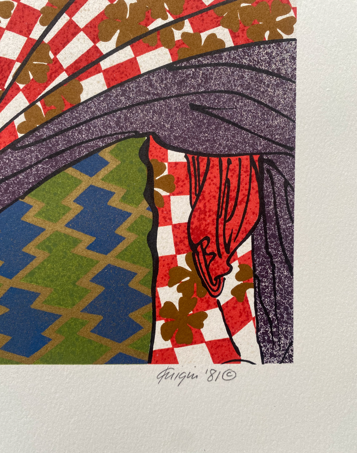 The print breathes life into the form. It is often erroneously listed as a lithograph, it is in fact a limited edition screen-print from an edition of 225. The print is hand signed by the artist in pencil: Knigin 81, and hand titled: Woman Playing a Poppin, After Utamaro. The edition number is 67.