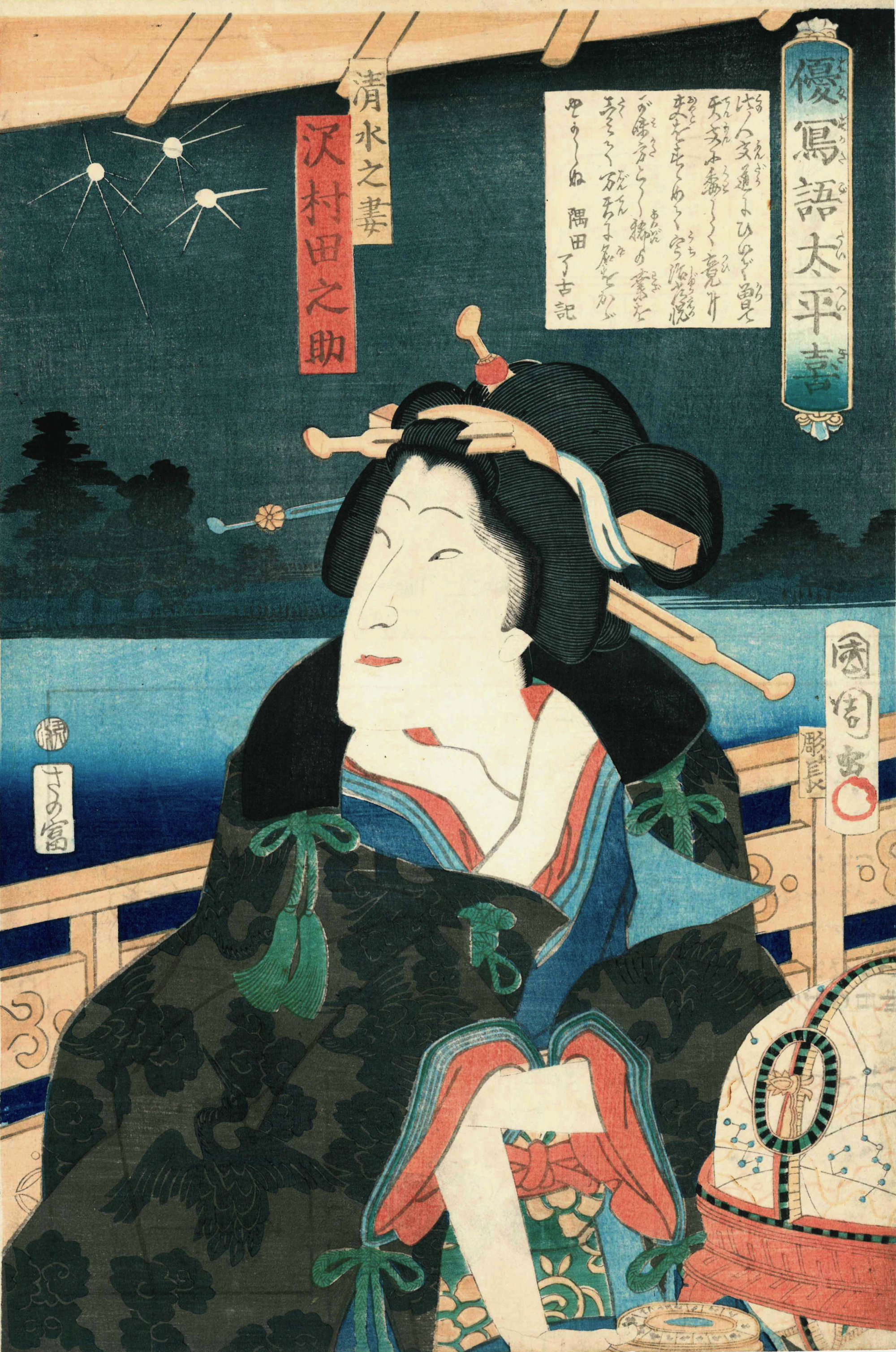 Here he plays the wife of Shimizu Muneharu. It is such a mysterious image… the barely understood astronomical dome, the zodiac calendar, the three stars in the sky… what can it mean? Well, the series title (I can only find one other print from this series) is, Bravery or Brave Actions of the Taiheiki. The Taiheiki refers to a great historical chronicle of the 14th century, detailing the struggles and heroism of the warring states period prior to Japanese unification. This print shows the loyal wife of a commander of the period, Shimizu Muneharu. In 1582, Muneharu’s castle was under siege by the warlord Hideyoshi. Hideyoshi diverted a river, flooding the moat and threatening the castle. Hideyoshi offered a peaceful settlement but only if Muneharu took his own life… seeing the situation was hopeless, Muneharu rowed out into the water, recited his death poem and ended his life. Watching the situation unfold, Muneharu’s wife took her own life and those of her children by drowning in the swollen moat.