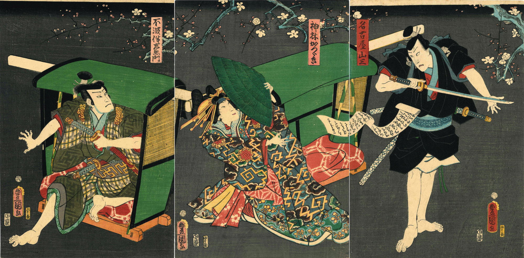 Utagawa Kunisada/Toyokuni III (1786-1865) A Scene from the Play Chiyo no Haru Tosa-e no Saya-ate, 1860, Oban triptych.