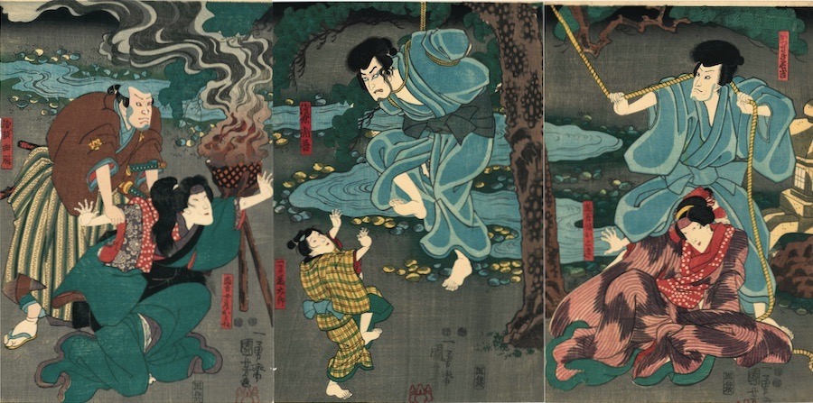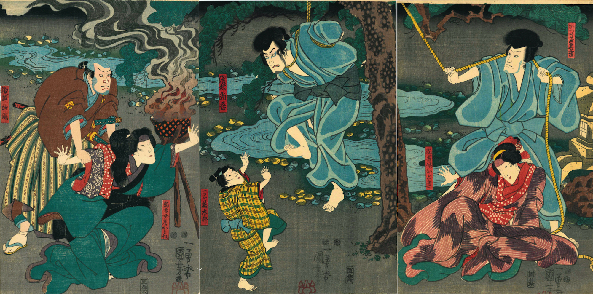Utagawa Kuniyoshi (1797-1861) Scene from the Play Sakura Gimiden, 1851. Oban Triptych.