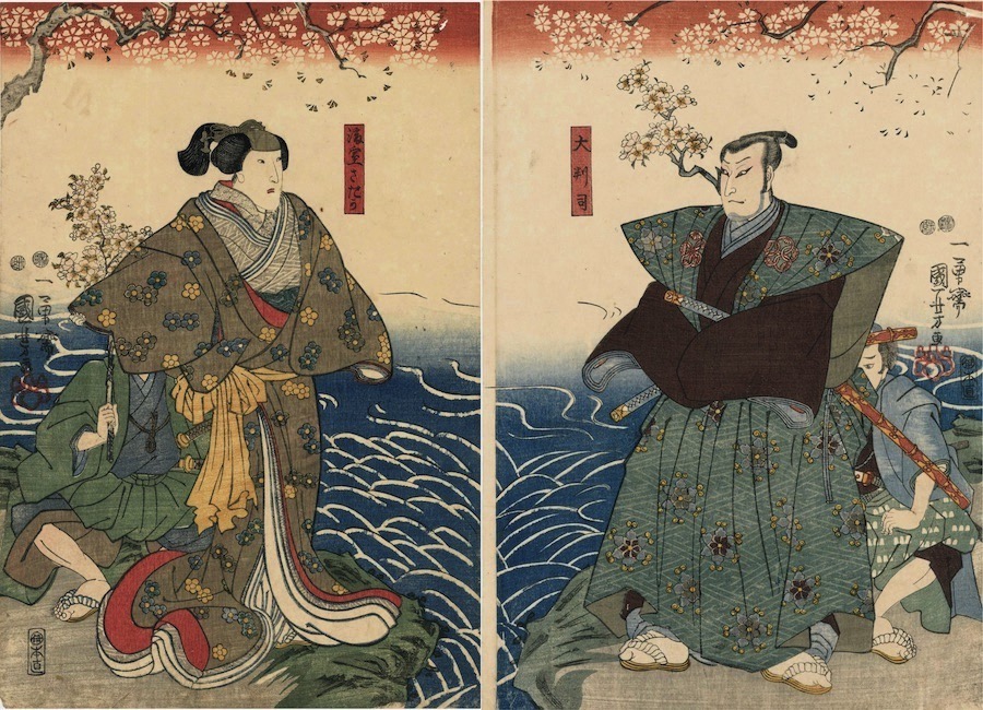 Because of the two stage assistants and the flattened space, I at first assumed that this was a bunraku, or puppet print. These puppets were often life size and manipulated by shady background puppeteers. This river scene appears in act III. A fierce clan leader, Iruka, fears that these two rival clans may be plotting against him. He summons Daihanji to Sadaka's late husband's palace and confronts the two rival parents. He orders Koganosuke to become his retainer and Hinadori to serve in his bed chamber. He gives them branches of cherry blossoms to be thrown into the Yoshino river as a signal of the answers of the two young people. Daihanji and Sadaka, (pictured here), Koganosuke’s father and Hinadori's mother, arrive with the ultimatums from Lord Iruka. Rather than submit, Koganosuke and Hinadori choose to die on the spot. Seeing their children's sacrifice, Daihanji and Sadaka reconcile their former feud, and Sadaka sends the severed head of Hinadori across the water to the expiring Koganosuke so the two young people may be united in death.