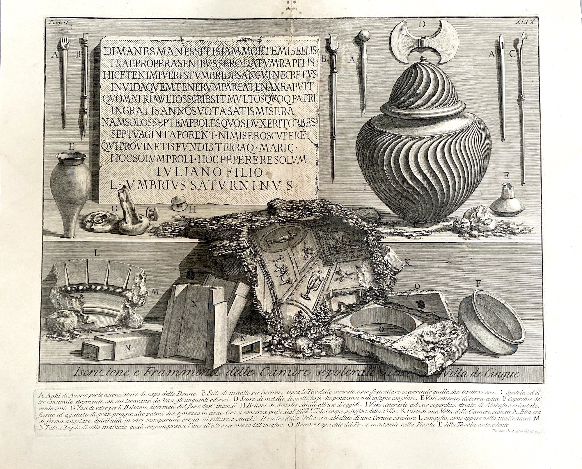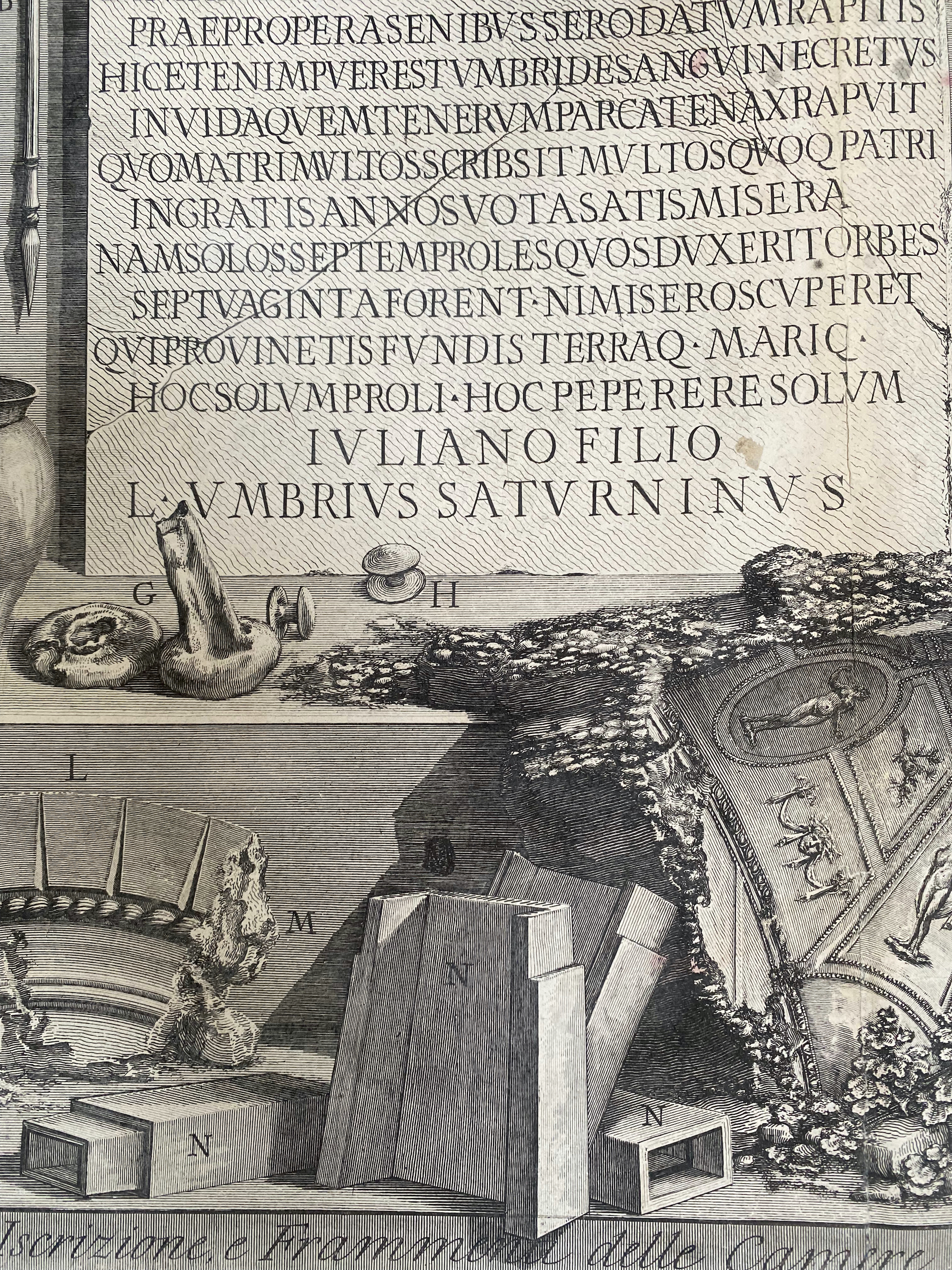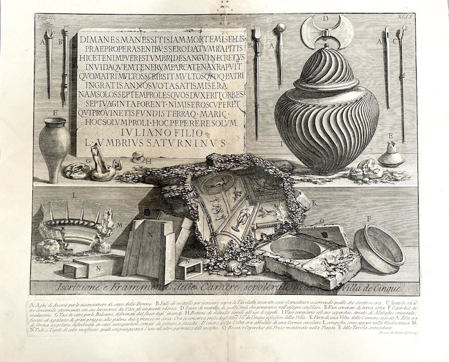 This print shows fragments from the tomb chambers of the villa de’Cinque. Visible and arranged on the back wall are delicate items of Roman personal hygiene… scrapers and so on plus needles and broken urns and architectural fragments… it is a very lovely piece and good clean early impression. Illus’ pg 272 of Piranesi, The Complete Etchings by Taschen.