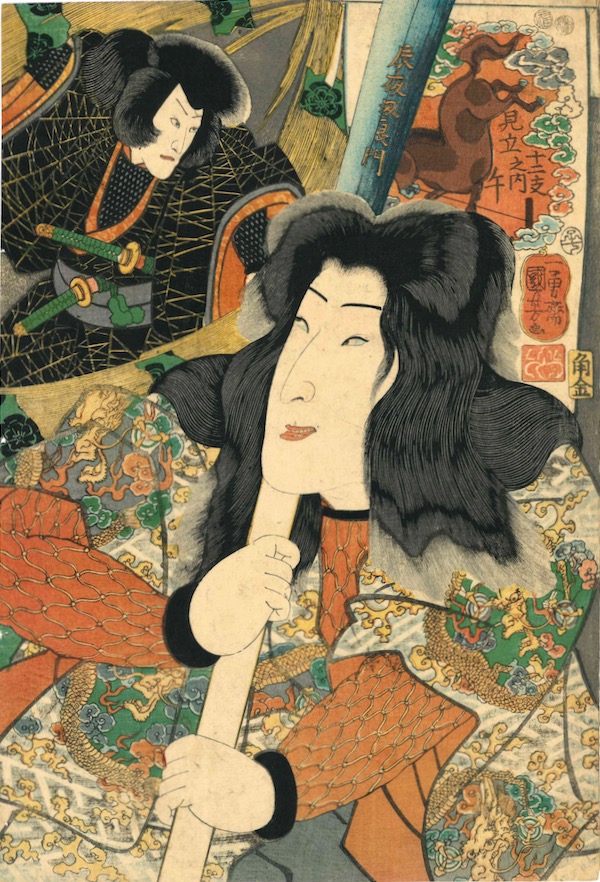 In 1852 Kuniyoshi executed a remarkable series called The Selection for the Twelve Signs. In the tradition of avoiding the frequent prohibitions on portraying actors in woodblock prints, Kuniyoshi chose to set well-known kabuki theatre stars in dramatic roles whilst nominally illustrating the animals of the Buddhist zodiac - you can see the horse in the banner behind the portrait head.