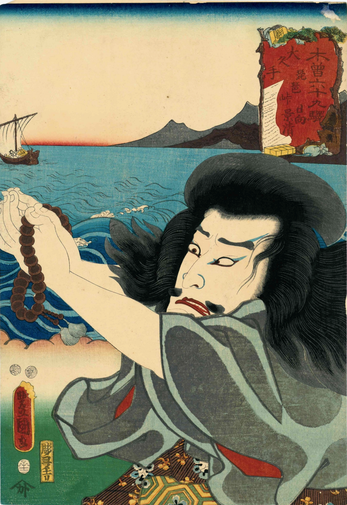 The play, Heike Nyogo-ga-Shima, was a favourite of the Ichikawa line of actors. Originally a puppet play (bunraku) only the act Shunkan was usually staged in kabuki.