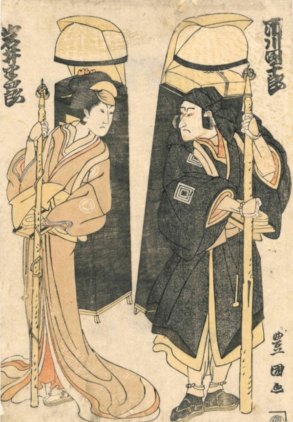 This print shows two actors, Iwai Hanshiro IV and Ichikawa Danjuro VI from an untitled actor series made in the mid 1790’s. I strongly suspect that this is a print commemorating the kaomise ("face showing") performance in 1797 at the Nakamra-za theatre. It shows the two actors as mendicants, carrying portable altars on their backs, each holding the shakujo, or ritual staff that announces their arrival at a house when in pursuit of alms. This ringing sound enables them to not break their vow of silence.