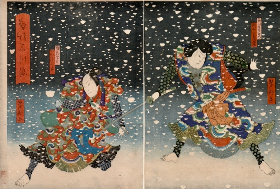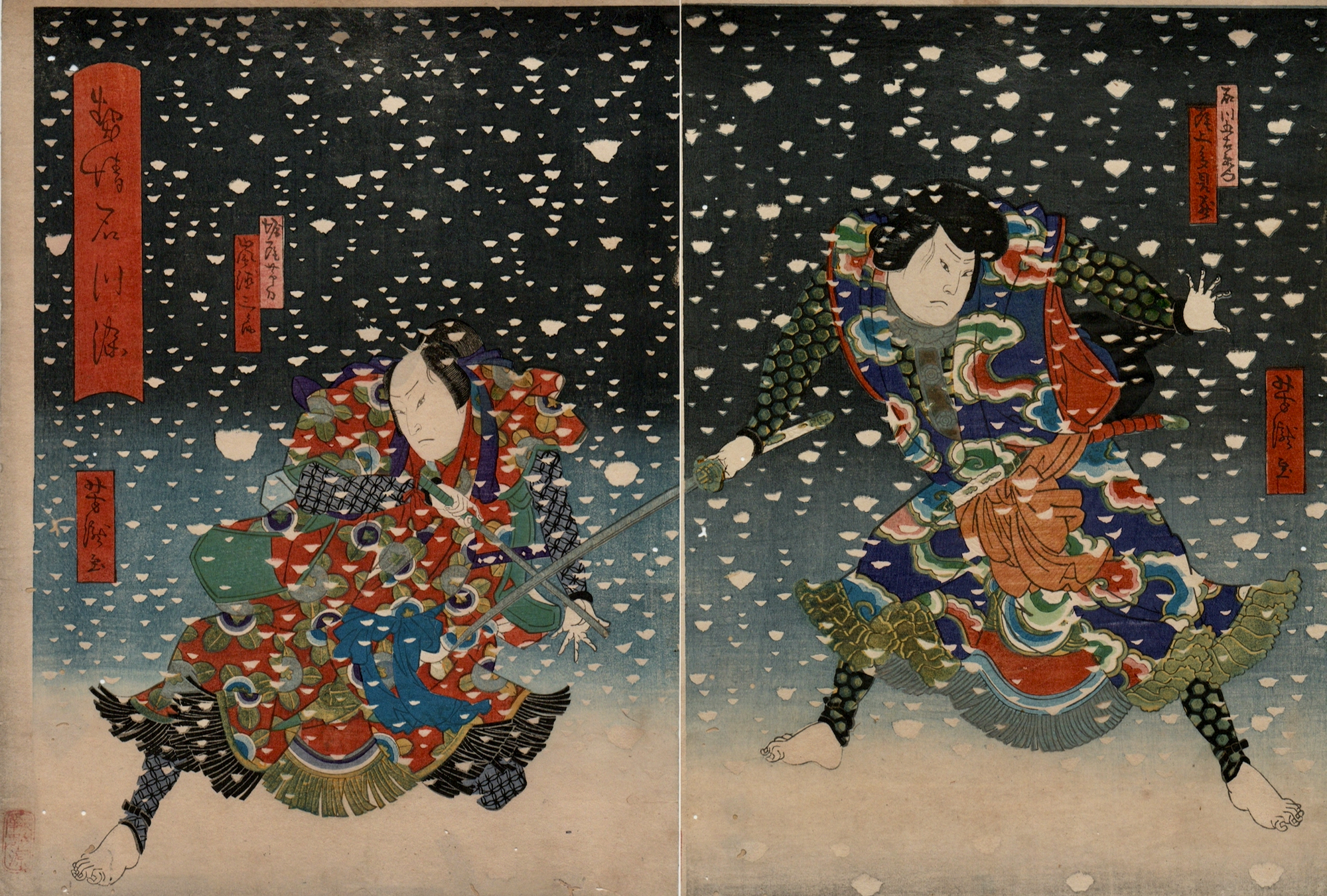 In this diptych, Yoshitaki shows a dramatic fight scene between Ishikawa Goemon played by Onoe Tamizo (on the right) and Horio Tatewaki played by Arashi Tokusaburo. Unusually an almost identical diptych of the same scene by Hironobu from the same production is well known; a good example is in the MFA Boston.