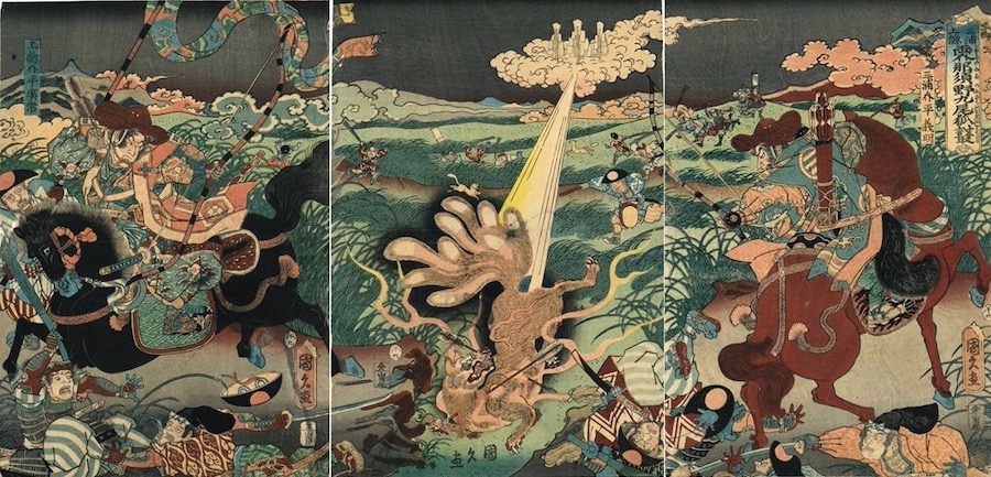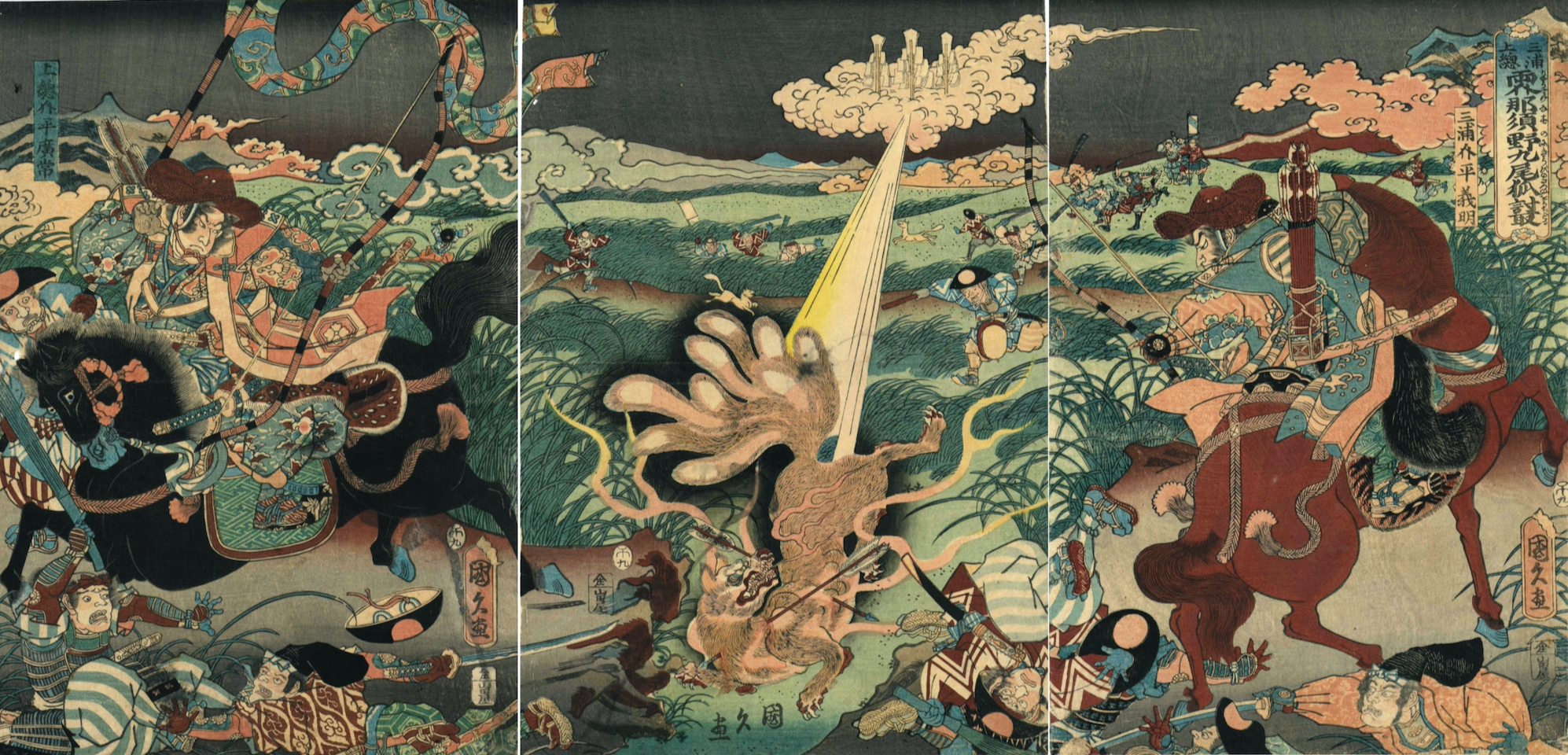 Utagawa Kunihisa II (1832 - 1891) Miuranosuke and Kazusanosuke Defeat the Nine-tailed Fox on Nasu Moor (Miura Kazusa ryôsuke Nasuno ni kyûbi no kitsune uchitoru) 1858. Oban Triptych.