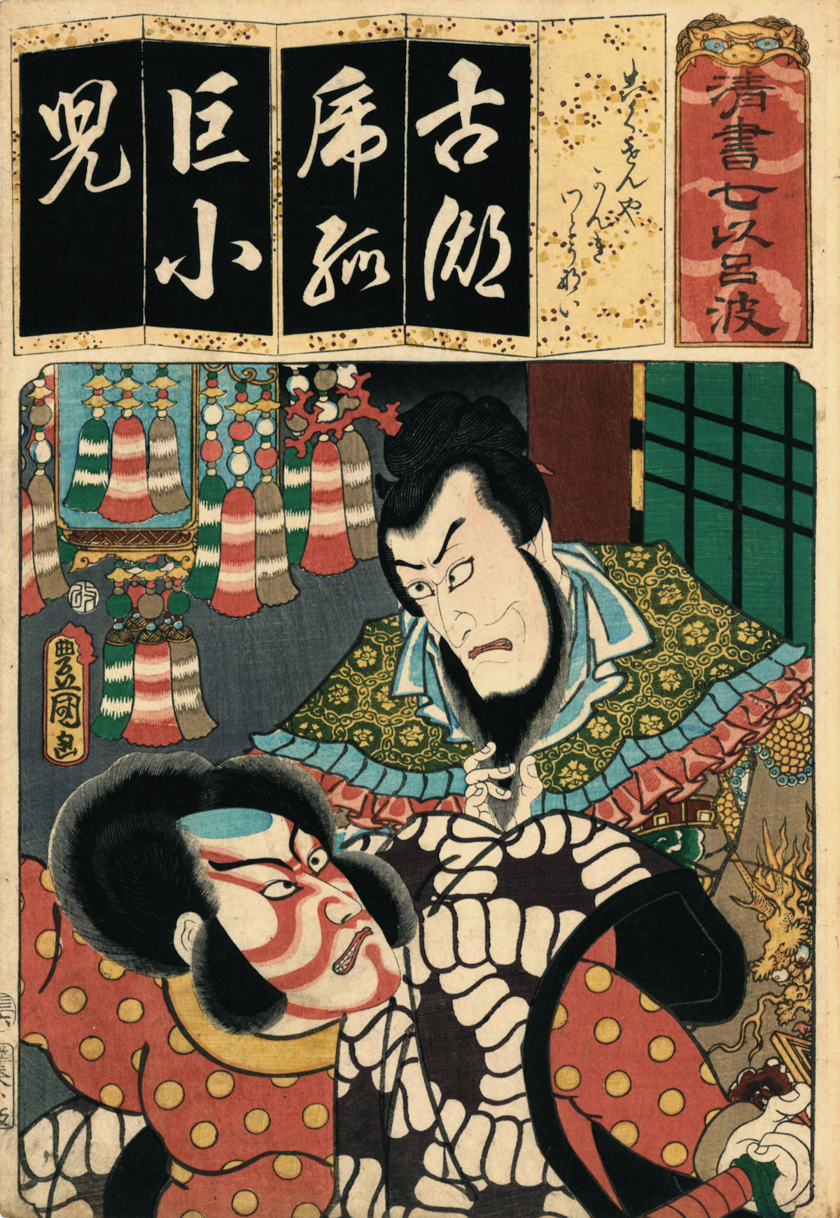 Utagawa Kunisada/Toyokuni III (1786-1865) Ichikawa Danjuro VIII, Ichikawa Ebizo V as Watonai and Kanki, 1856. Oban.