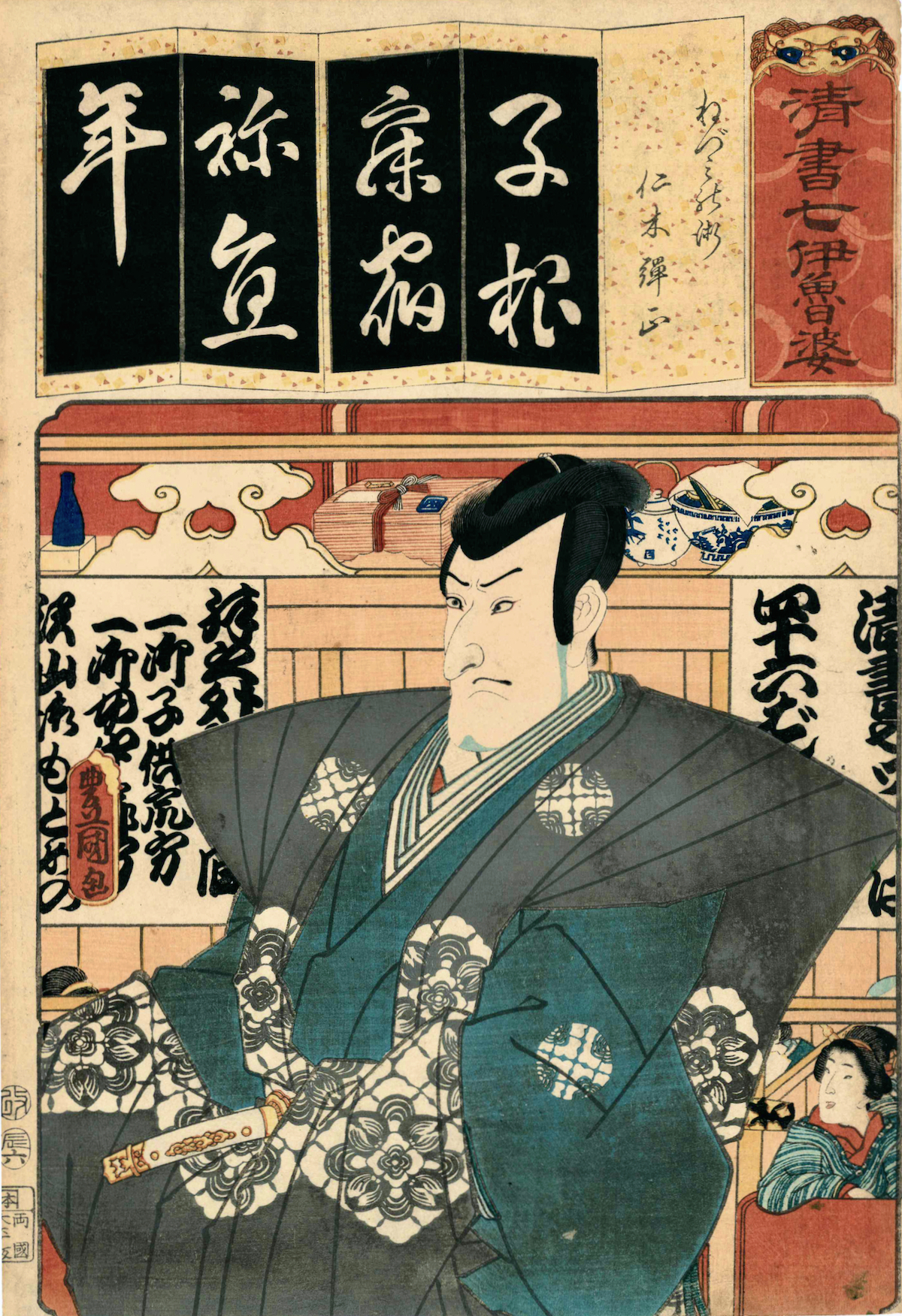 Utagawa Kunisada/Toyokuni III (1786-1865) The Seven Variations of the Iroha: Matsumoto Koshiro VI as Nikki Danjo, 1856. Oban.