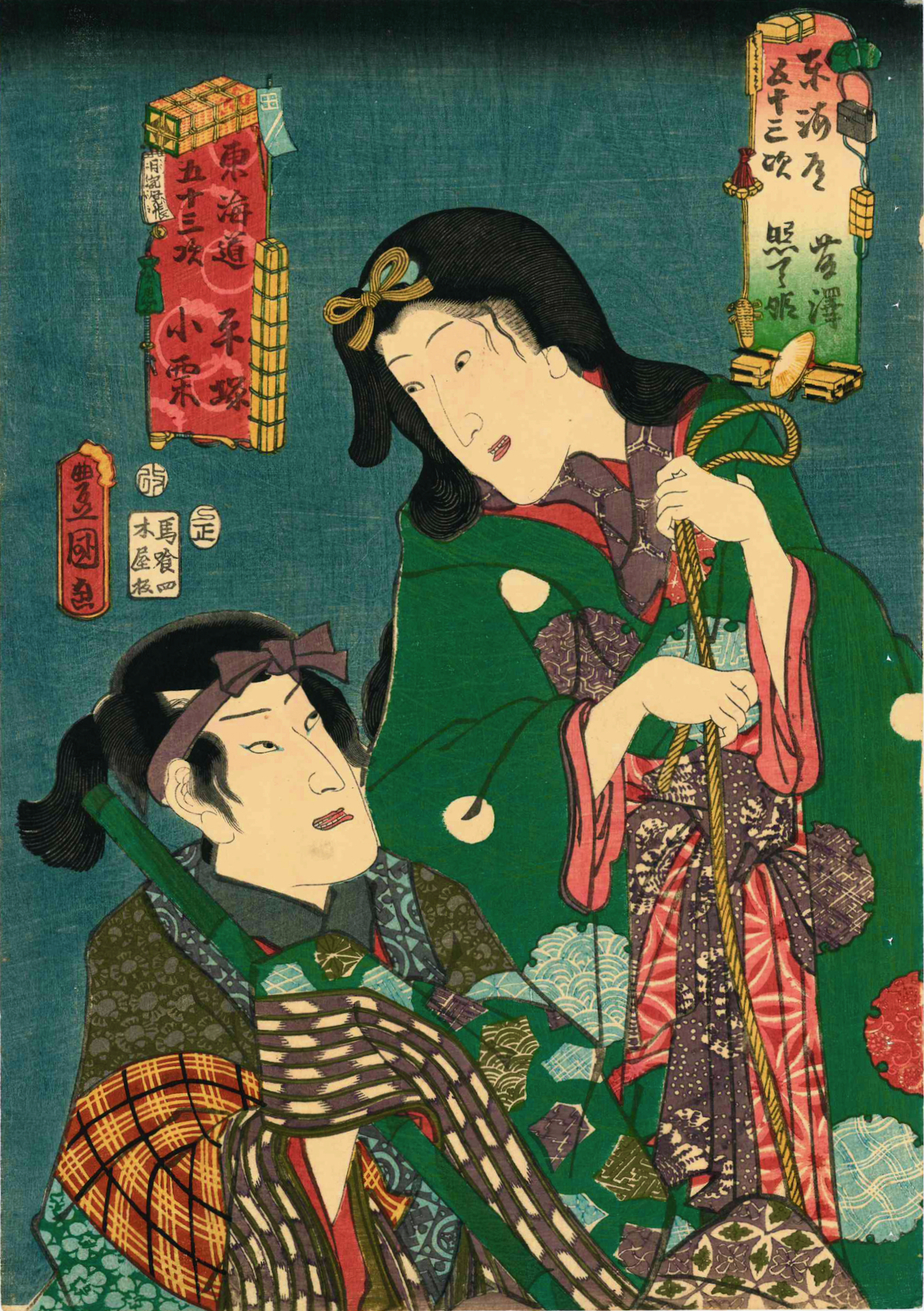 Utagawa Kunisada/Toyokuni III (1786-1865) Fifty-three Stations of the Tôkaidô Road: Fujisawa and Hiratsuka - Actors Iwai Kumesaburô III as Terute-hime and Nakamura Fukusuke I as Oguri, 1853. Oban.