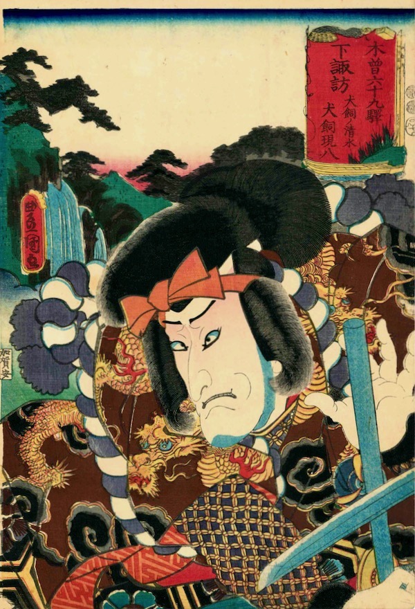 Kunisada capitalises on the cunning innovations of the preceding Tokaido series and borrows landscapes and stations to portray yet more actors and kabuki roles, set in a glorious riot of pattern and quirky, other, meaning. Here we see the actor, Seki Sanjuro III in the famous role of Inukai Genpachi. The setting is from the extraordinary and supernatural novel, Hakkenden inu no soshi no uchi ("Book of The Eight Dog Heroes"). Originally a novel, which took thirty years to complete, the story was quickly turned into a popular kabuki play. The complex plot narrates the story of the eight offspring of a supernatural marriage between a princess — Princess Fuse — and her father’s dog, Yatsufusa. Shamed and tricked into the conception, she decides to kill herself and the eight beads of her rosary, each representing a Buddhist virtue, become crystal orbs and disperse, the children being reborn to normal mothers sixteen years later. The plot twists and turns as the eight brothers become acquainted as adults. Each of the brothers possesses supernatural powers. The first act of the play shows the sometimes comical scenes of the brothers, none of whom know each other, becoming acquainted and then pledging to revive the fortunes of their family, the Satomi. The last act of the kabuki drama, which was wildly popular with audiences, involves the brothers assembling at an inn and defeating a gigantic flying cat. The performances utilised all of the latest special effects to bring to life the aerial combat between the brothers and the transformed witch.