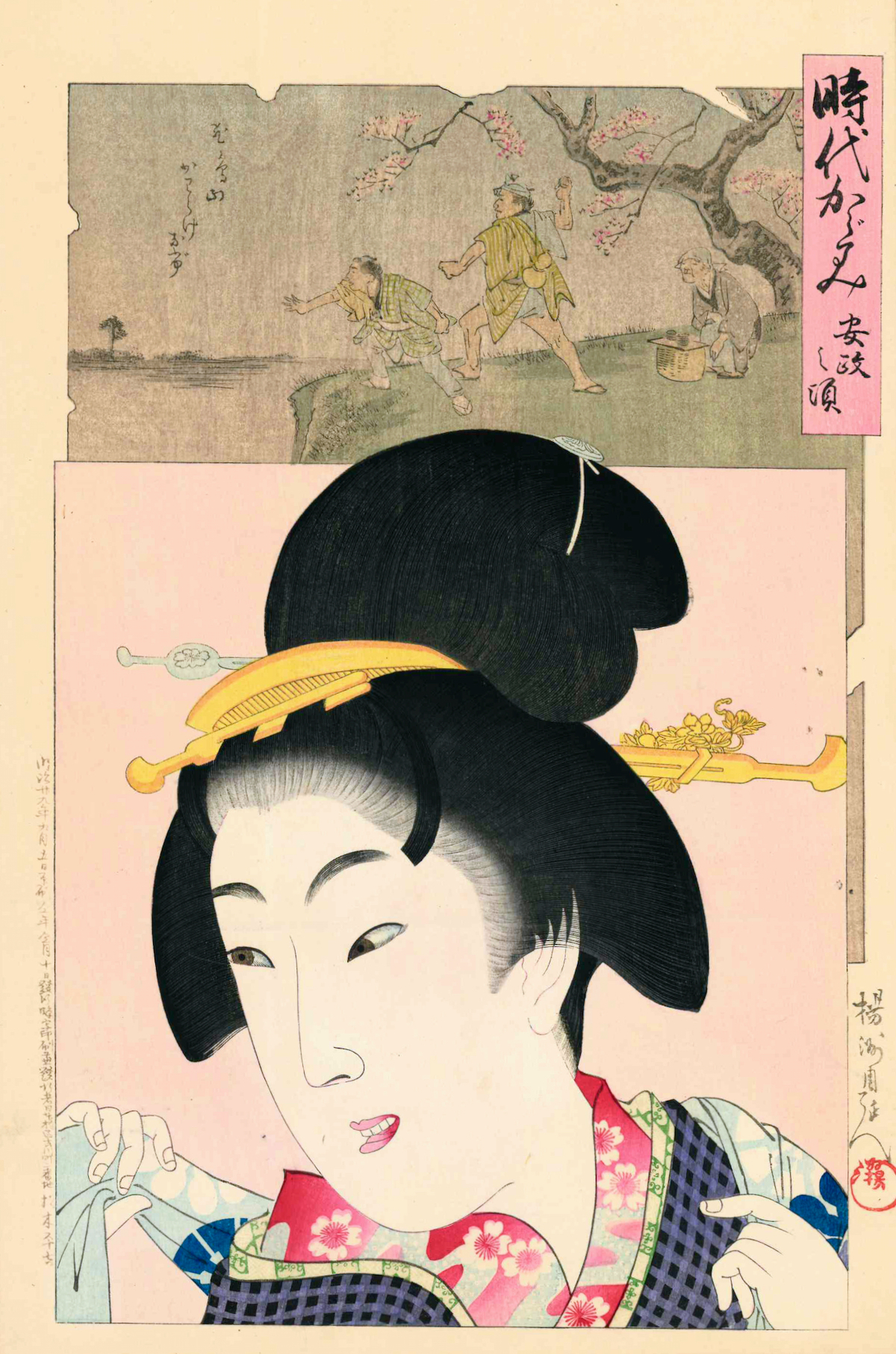 These exceptional prints were a masterpiece of woodblock printing. For sheer density of colour and sureness of line they are unbeaten. This print shows woman of the mid 19th century - just prior to the Meiji Revolution. A courtesan most likely, with the elaborate hair pieces and in the faux tattered inset we see men throwing pieces of roof tile from a cliff… this presumably an image of insurrection and revolution.