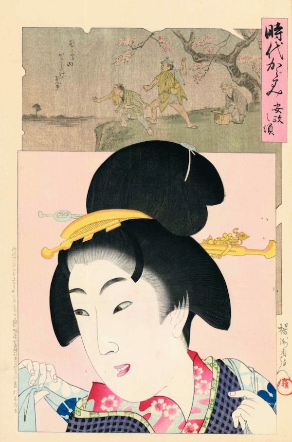 This whole series is one of the outstanding achievements of late nineteenth century Japanese art. One of his best series, A Mirror of the Ages showed women by fashion and hair style throughout history. There is of course the longing for the past and yet these prints are unmistakably modern and of their time. The subject in each print is the finely rendered foreground figure shown as a portrait head and in the upper quarter, a scene in grisaille from the chosen period. The quality of printing is outstanding, especially in Chikanobu’s use of white for the rendering of the powdered faces. It is often forgotten by art historians that this was the period above all others when the technique of woodblock printing achieved its zenith whilst at the same time there were artists of stature to execute it.