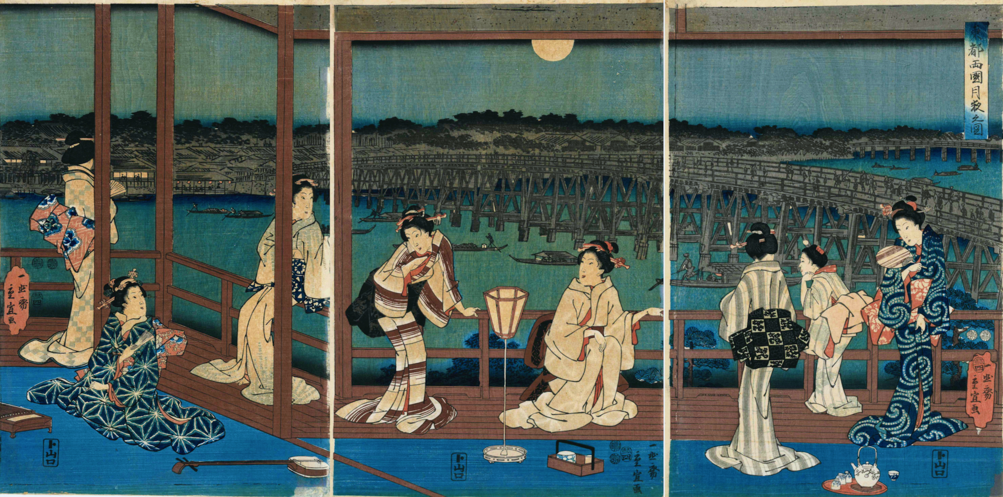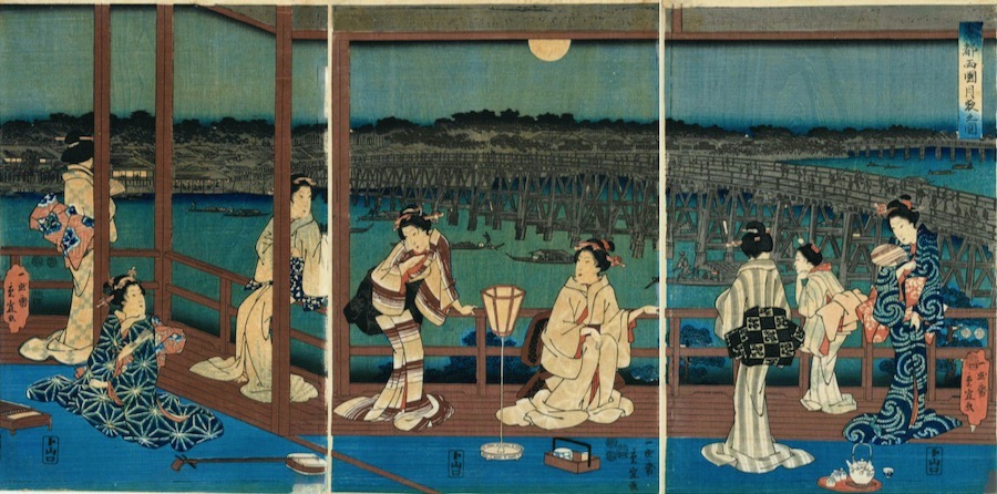 Attribution can really only be done by signature and consensus. This stunning triptych could so easily be the work of Hiroshige I. It is a rare print… I have found only one other copy. It shows an evening scene of ‘beauties’ under moonlight before the astonishing Ryogoku Bridge. The bridge across the Sumida River was built in 1659 but was rebuilt and repaired many times. It was the focus of many Edo-period woodblock prints.