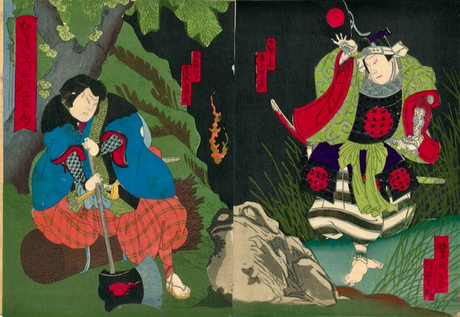 A superb Yoshitaki print showing two samurai - or Ronin - beside a stone toad transforming in a mystical act. We can see it is mystical or supernatural by the orange flames floating in the centre. The play — it is a kabuki drama of the Osaka School - could be Tenjike Tokube… The story revolves around the theft of a ritual, magical sword and the substitution and theft of fake copies. The scene we are witnessing follows the fortunes of Tokubei, a sailor who arrives at court full of exotic tales of foreign lands. The thief of the sword, Sokan turns out to be his dying father who is in fact a Chinese envoy sent to bring down the shogunate. As he dies he entrusts Tokubei with his magical powers and the dread mission of regicide. Tokubei tries out his newly gained skill, and changes a stone into a huge toad. He is all set to take over his father's ambition of overthrowing Japan.