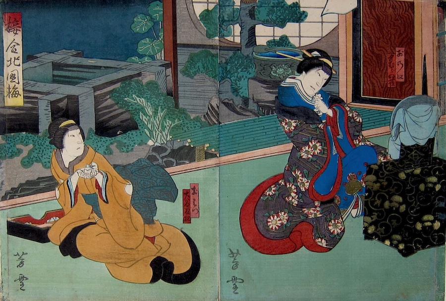 Nansui Yoshiuki (ca 1835 - 1879) Two Actors in Female Roles, ca. 1860. Deluxe Chuban Diptych.