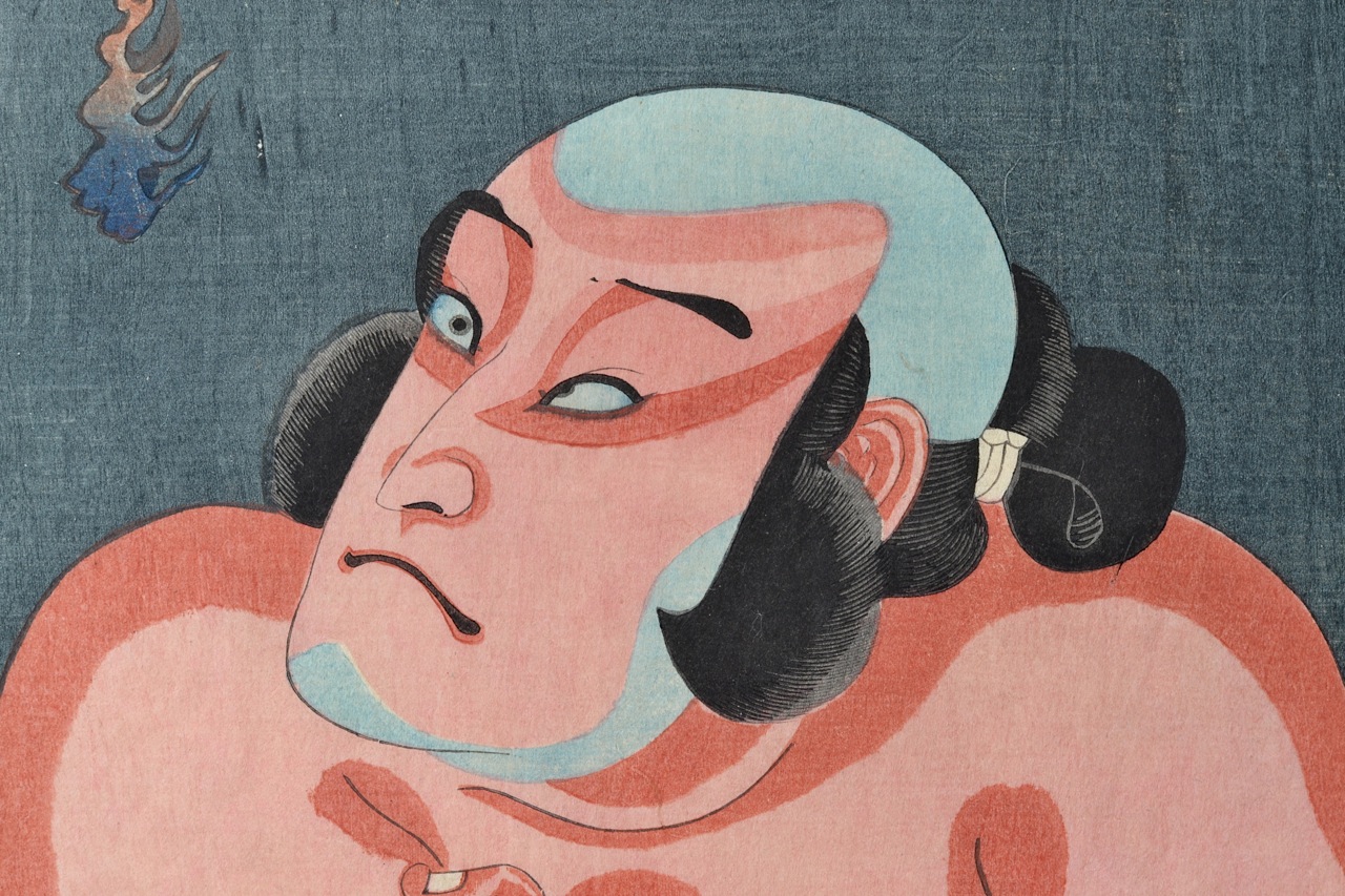 About a year ago, we presented an exhibition Re-assessing Kunisada, in which rather than looking back to the 18th Century for Kunisada's inspirations, we looked at the vibrant urban culture which informed his print-making. Best known for his depictions of the kabuki theatre, Kunisada was not afraid to plunge into the world of kabuki itself, a place of sedition and rebellion, of rowdy, unmanageable townspeople; something he succeeds in conveying with the brash use of colour and line in his later prints.