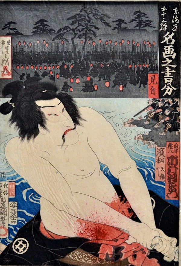 This is the outstanding design from a little known Tokaido Road series of 1860. The series was done in collaboration with Kyosai who did various background scenes; Kunisada was nearing the end of his life and was yet phenomenally productive during the period 1858-62. The quality of his designs and the standard of the production that he was able to command were extremely high, as in the superb drawing and gruesome characterisation of Gonpachi’s suicide.